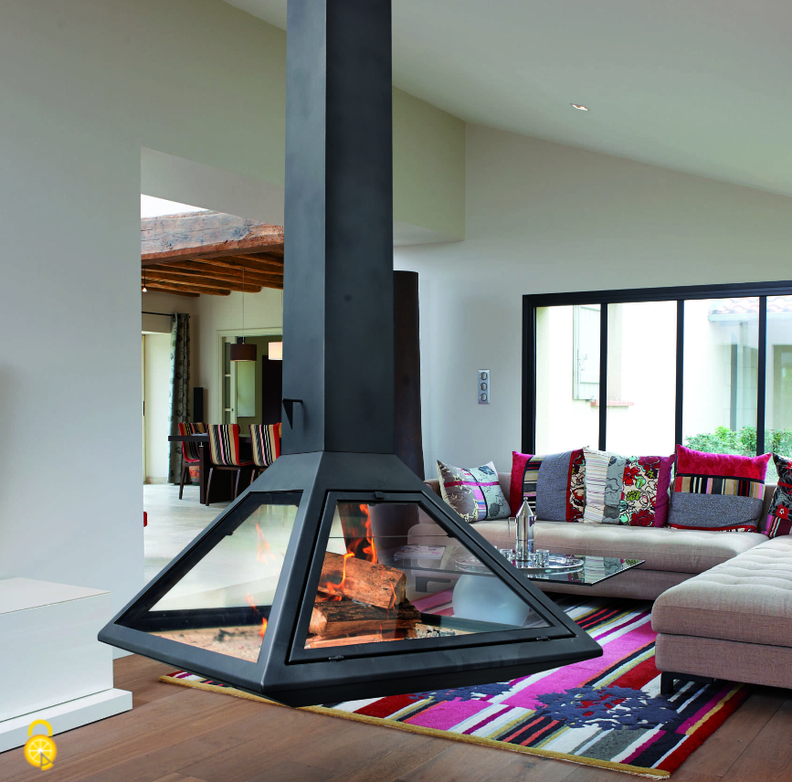 Dans cette cheminée centrale fermée cohabitent la puissance et la convivialité. Sa forme pyramidale et son encombrement étudié permettent une souplesse d’adaptation en fonction des différentes installations. Effectivement, toute la technicité de notre cheminée foyer fermé provient de son conduit réalisé sur-mesure en un seul élément pour une grande hauteur sol/plafond grâce à une fabrication 100 % française. Avec les 4 faces vitrées dont 2 sont basculantes, la cheminée contemporaine suspendue vous permet une vision du feu à 360 degrés.